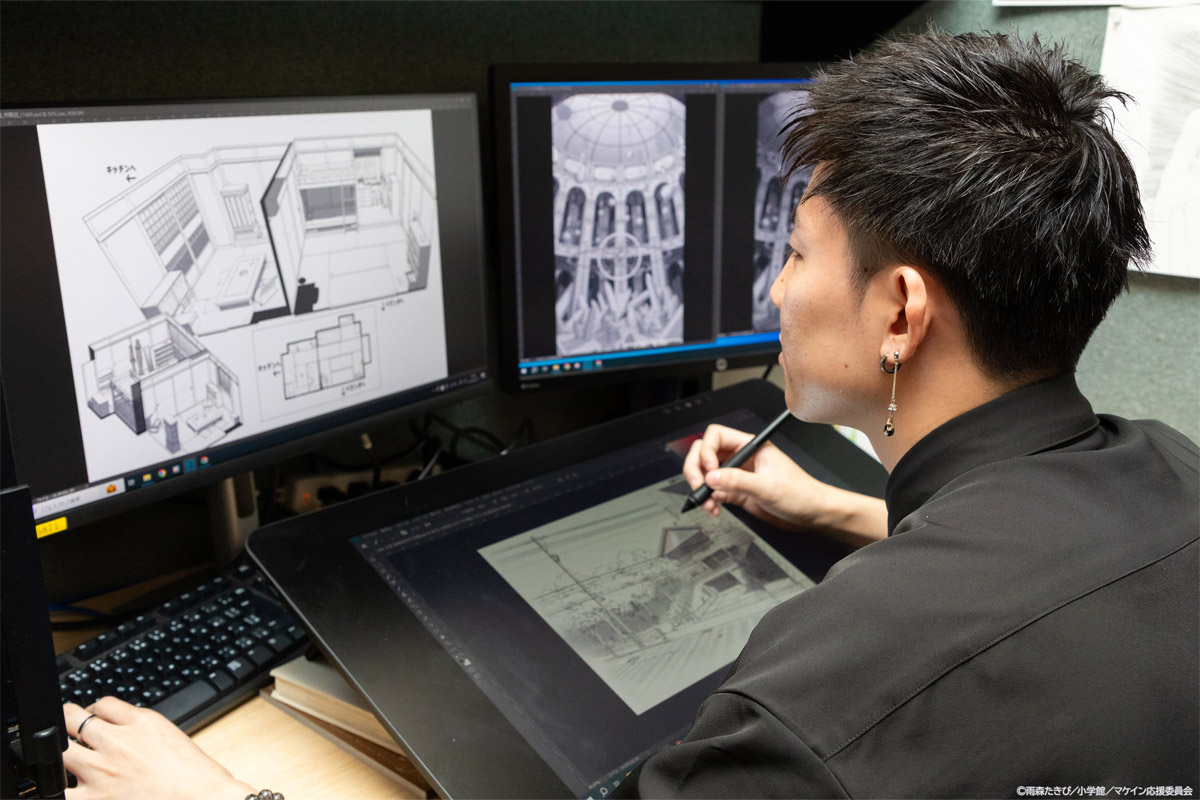 一言で言うと「アニメーションの世界観を線画で創る」お仕事になります。背景の世界観やデザインなど、監督とすり合わせを行い、イメージに合わせて形にする大切なセクションです。基本的には、構造やスケールが分かりやすい引きのものと、細かい部分をクローズアップした寄りのものを作成します。オリジナリティを求められることもあるため、「遊び心」も必要です。