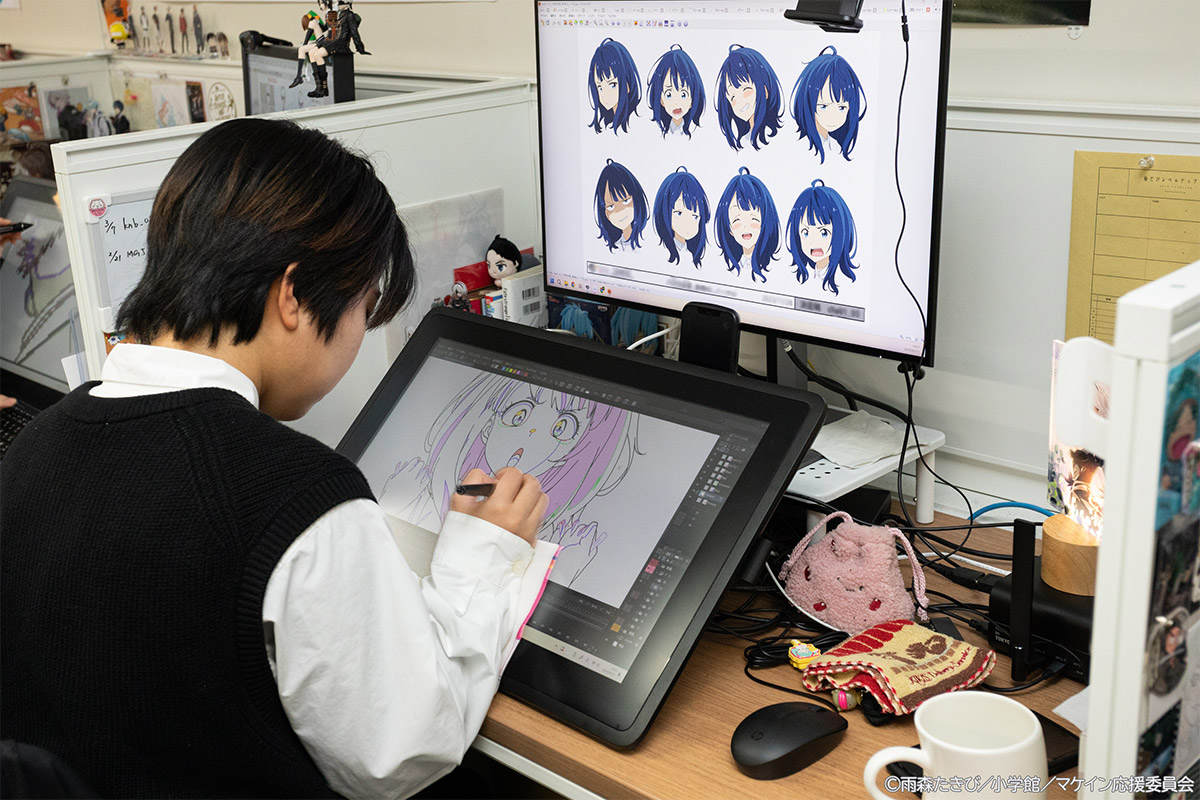 原画担当から上がってきた素材を制作進行の方からもらって、素材の不備や原画とタイムシートを合わせてみたときのミスがないかをまず確認します。希望納期に間に合うよう、社内または社外に素材を渡して作業をしていただきます。その作業されたデータに、中割りに不自然なところやミスがないか、書き出し時のデータに不備がないかを確認し、次の仕上げ担当に回します。色がついて映像として出来上がったものにも目を通して、そこでも違和感がないかをチェックします。