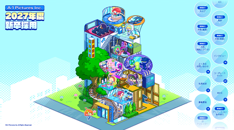 A-1 Pictures社屋をイメージした建物内にカーソルを合わせるといろんなキャラクターに出会えるので、ぜひサイトの隅々までご覧ください!